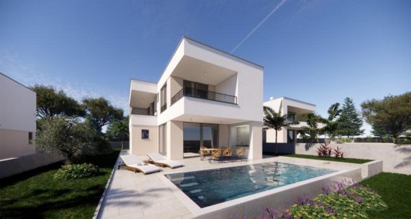 Ny byggnad med pool och havsutsikt, ön Krk