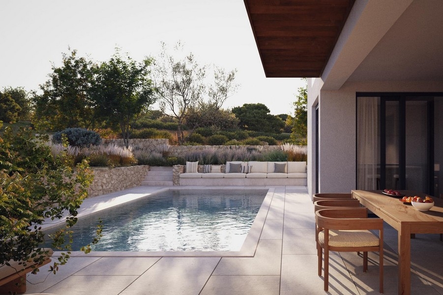 Parhus S1 med pool (ca 26,25 m²) och ca. 187 m² boyta har tre sovrum, två badrum, vardagsrum med kök och matplats, toalett, förråd och terrasser. 2 parkeringsplatser. Inköpspris: 550 000 EUR