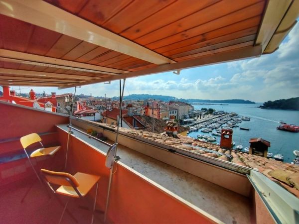 Terrassen erbjuder vacker utsikt över staden, havet och hamnen. Lägenheten ligger mitt i Rovinjs livliga centrum. Avståndet till havet är endast ca. 20 meter. Lägenheten erbjuds fullt möblerad.