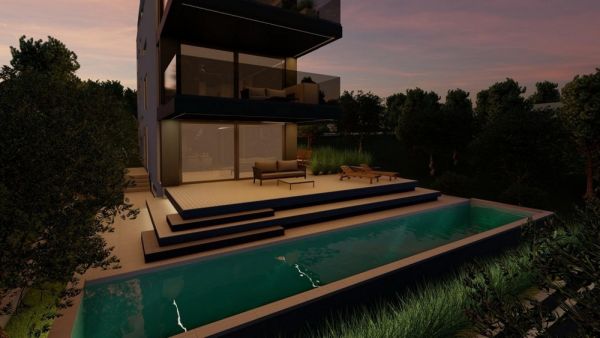 Denna exklusiva lägenhet på bottenvåningen ligger i en modern ny byggnad i ett utmärkt läge nära Kozinos kust, Zadar-regionen, Dalmatien. Lägenheten har en privat trädgård med pool. Denna lyxiga lägenhet har en boyta på ca. 200 m²: